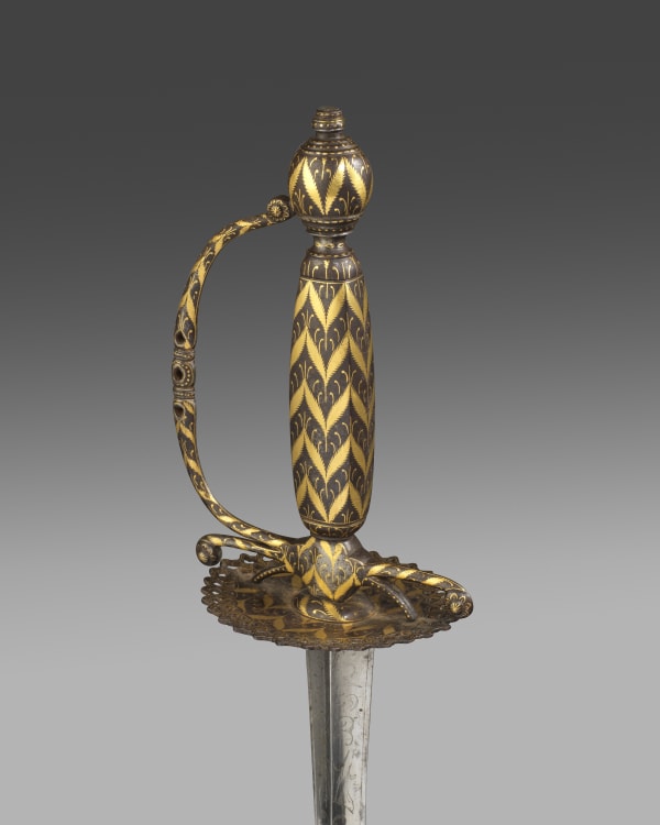 Group of Four Small SwordsA small-sword is a light one-handed sword which evolved out of the longer and heavier rapier of the late Renaissance. This edged weapon would have been carried by aristocrats and high-ranking officials as part of their fashionable attire in Britain and India throughout the 18th century. The hilts in our group were made in workshops in Northern India, probably close to East India Company factories around Lucknow and Murshidabad. The hilts’ shapes are European, but the koftagari work, a technique by which steel is inlaid with gold, is Indian. The actual inlay is reminiscent of Mughal decoration of the period and sometimes Neo-classical design, which would have been pleasing to the European eye.